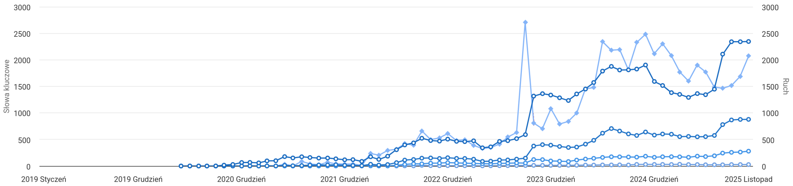 Wdrażanie strategii rozpoczęliśmy w marcu 2022 roku od optymalizacji strony internetowej. Było o tyle prościej, że tworząc stronę zadbaliśmy już o przyjazność adresów URL, meta dane czy strukturę nagłówków. Uzupełniliśmy stronę rozbudowanymi treściami, a także utworzyliśmy bloga, na którym regularnie publikujemy artykuły branżowe. Podejmowane działania sprawiają, że ruch organiczny generuje ponad 200 kontaktów miesięcznie przez formularz kontaktowy, a także kilkadziesiąt podjętych prób kontaktu w inny sposób.